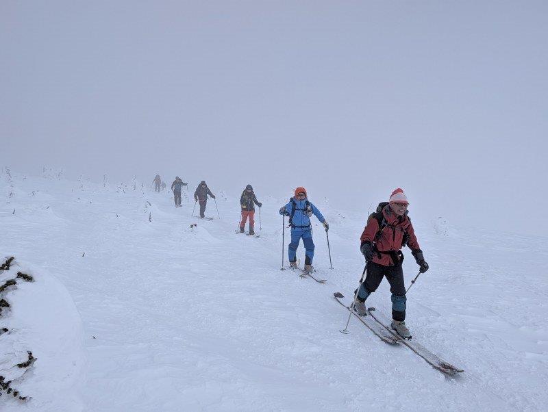若女平スキーツアーは調べてみたら今回で52回目。個人的にはあちこち不具合があり不安だったのだがゴンドラとリフトを利用すれば比較的お手軽な若女平ならばと久しぶりに山岳会の事業に参加してみた。スキー客で激混みの湯本駅から天元台へ。天候は比較的に穏やかだったが稜線は厚い雲。その雲の流れもかなり早く天候はかなり悪そうだった。北望台は多くのスキーヤーやスノーシューの登山者でにぎわう。シールを貼り終えればツアーの始まり。すでに深々としたトレースが伸びておりラッセルは不要。しかし中大巓を巻き梵天岩が近づく頃にはすっかり雲の中となり視界不良。さらに厳しいほどの冷たい風。こんな天候ではと隊長からは早々に山頂や山小屋の回避が告げられる。天狗岩からはショートカットで若女平のツアーコースへ。樹林帯に入ると風はいたって穏やか。適当な地点でシールを剥ぎ滑降モードに。滑り始めるとみんな水を得た魚のごとく勝手気ままに散って行く。無線でときどき集合したりするのだがすぐにばらけるのはいつものとおり。雪面は快適で1時間ほどで若女平。ここまで高度が下がると日差しも降り注ぎ楽しいランチタイムがはじまる。休憩後は細尾根を通過し小坂の急斜面、杉林と滑り降りてゆきツアーが終了した。