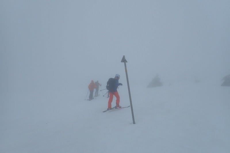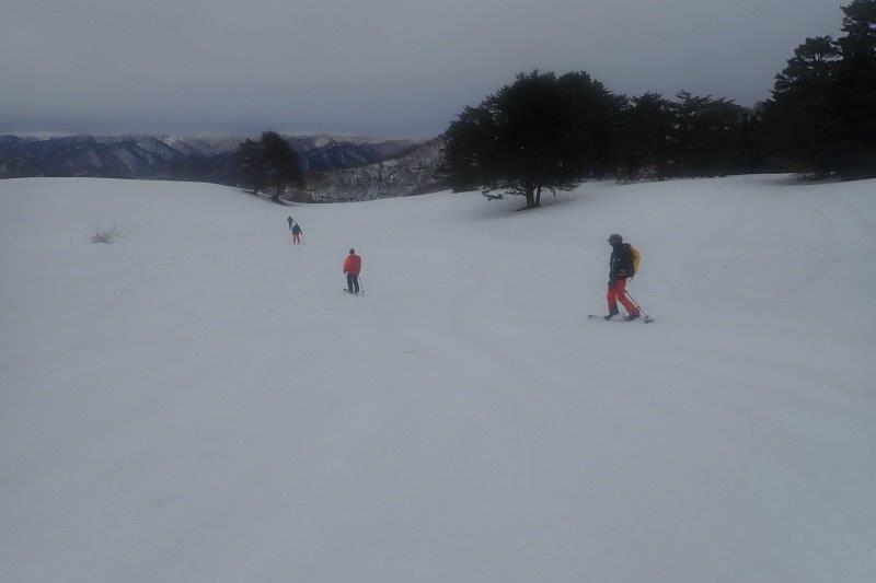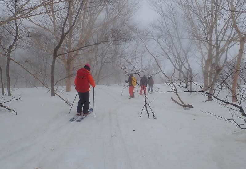 体調イマイチなので誘ってもらえるだけありがたい今シーズンの大沢下り。この日しか日程はとれないとあり天気イマイチなのも少し気がかり。湯本駅からは濃霧強風のなかゴンドラ、リフトを乗り継いで北望台。歩き出すと稜線は極寒と強風濃霧の世界。こんな天候なので週末だがツアーコースに向かう人は我々以外には皆無だった。いつもは快適な緩斜面の人形石付近。しかし視界不良で雪面は堅くほとんどアイスバーン。なんでもないところで転ぶうえに足が攣りそうになる。弥兵衛平付近も平坦とあって方向感覚がわからず右往左往。こんなときこそGPS頼りなのだが衛星が捕捉しないのか気付けば明月荘からは遠ざかる一方。一緒に歩いてくれた仲間からの信用は全くなくなってしまった。明月荘には2時間30分かかって到着。明月荘の2階入口は先発隊が除雪していてくれていた、感謝!。休憩後も濃霧と強風一色。しかし高度が下がるにしたがい雪面は柔らかくなりみんな飛ぶように滑って行く。ようやくたどりついた忠チャン転ばし。ダマシダマシ渋川の横断地点。渋川からはシールで砂盛へ。積雪がかなり少ないせいで周囲の景観が全然違って見える。個人的には26回目の大沢下りだがこんな光景は初めて。標高が下がったせいで雪はいつしか小雨に変わる。雪は柔らかいのだが滑りすぎて情けないことに至るところで転倒。林道にでればツアーも終盤。牧場上部の上空は厚い雲に覆われ夕刻の薄暗さ。米沢市街地もかすか。最後の林道は一部雪が切れていたがなんとかスキーははずさずに。薄暗い樹林帯を抜けると大沢駅が見えてきた。